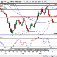 The US GDP figure was slightly better than expected and almost in line with analyst expectations. It therefore didn’t have a significant immediate impact on USD. The only dollar pair moving more strongly after the announcement is the USDCAD as the Canadian GDP number came out at the same time and was a disappointment. USDCAD is up by 0.66% at the time of writing and approaching yesterday’s shooting star high at 1.2538. Today’s high at the time of writing: 1.2518. Fibonacci levels in the above chart point to potential support levels with 38.2% coinciding with 50 day SMA and 50% with a sideways move from mid-may. The US Dollar Index (DXY) is still trading at intraday support created by lower Bollinger Bands that have supported the index since yesterday.